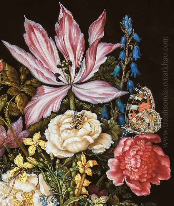 Bức tranh không chỉ là một sự kết hợp hoàn hảo giữa màu sắc và bố cục mà còn là biểu tượng của sự sống, cái đẹp và thời gian. Các loài hoa được sắp xếp khéo léo, đan xen giữa những gam màu ấm và lạnh: đỏ thắm, vàng kem, xanh lam, hồng phấn..., tạo nên một tổng thể hài hòa, sống động như đang khoe sắc dưới ánh sáng nhẹ nhàng. Một chi tiết thú vị là sự xuất hiện của những cánh bướm và ong, góp phần làm tăng thêm cảm giác chân thực và sinh động cho bức tranh.