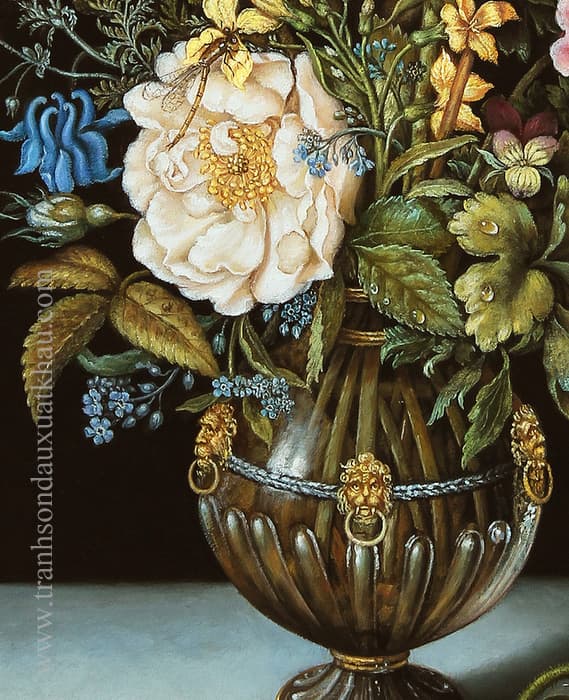 Bên dưới bình hoa, người họa sĩ đã đặt một bông hoa rơi và một con bướm đậu nhẹ trên mặt bàn đá, như một lời nhắc nhở về sự mong manh, phù du của vẻ đẹp tự nhiên. Đây là một yếu tố biểu tượng thường thấy trong nghệ thuật tĩnh vật cổ điển, gợi lên suy ngẫm về vòng tuần hoàn của sự sống.